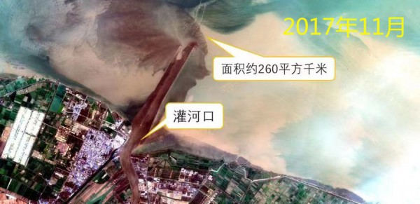 而灌河口2017年与2021年的变化亦非常明显。在2017年的卫星遥感照片上,只见灌河口的部分地区海水颜色呈现出褐红色,而2021年的照片显示,灌河口的海水颜色已经恢复自然面貌。