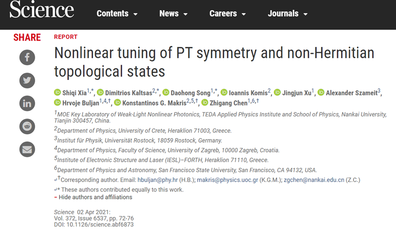 南开大学物理科学学院、泰达应用物理研究院陈志刚、许京军教授带领的课题组与克罗地亚萨格勒布大学、希腊克里特大学、德国罗斯托克大学的课题组合作研究,在国际上首次建立了一个非线性非厄米拓扑光子学平台,从而实现了利用非线性在光学体系对宇称时间对称性和非厄米拓扑态的调控。研究团队还发现了非厄米体系中拓扑态在接近决定PT对称破损的奇异点时,敏感性和鲁棒性的拮抗效应,以及通过局域非线性对系统整体PT对称性的操控原理。这一创新成果改变了人们对开放拓扑体系中非线性效应的认识,为非线性拓扑光子学及其相关前沿领域的研究开辟了新方向。该研究成果近日以“Nonlinear tuning of PT-symmetry and non-Hermitian topological states”为题发表在国际权威期刊《科学》上。
