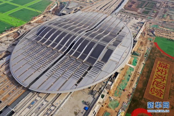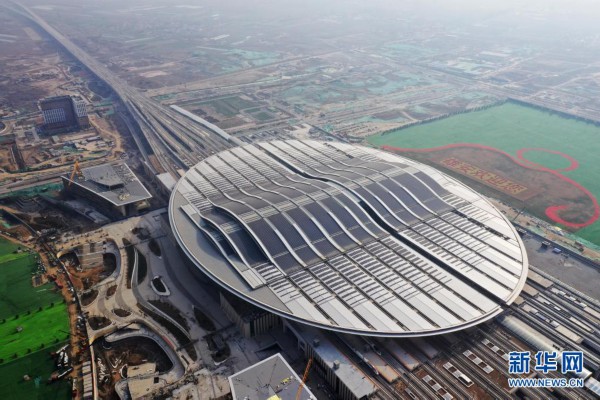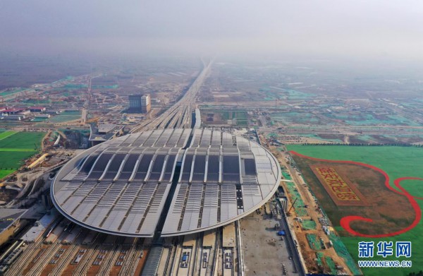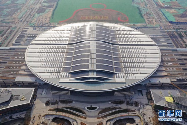 3月17日拍摄的京雄城际铁路雄安站(无人机照片)。