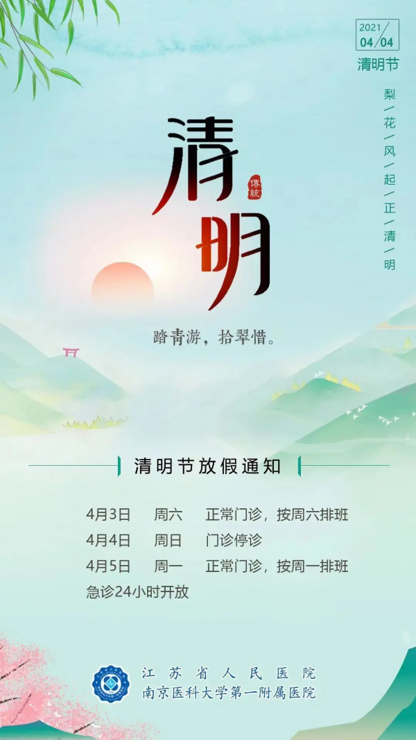 丁家桥本部院区、江北院区医疗工作同步安排如下:4月3日(周六)、4月5日(周一)门诊全天开诊,医技科室及与门诊相关的辅助科室全天开放;4月4日(周日)门诊停诊1天