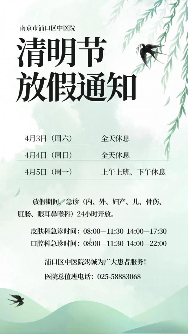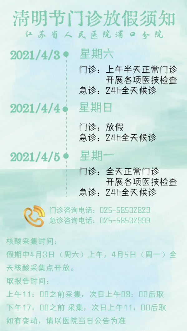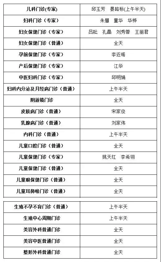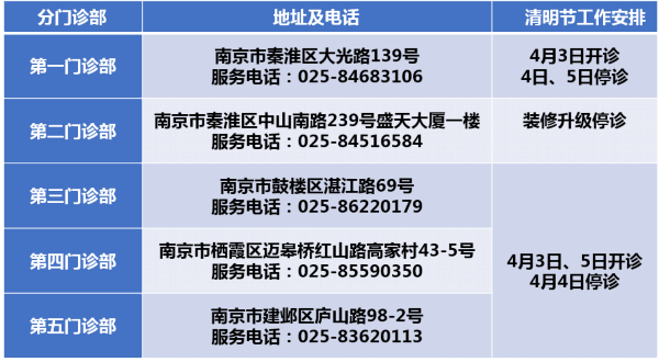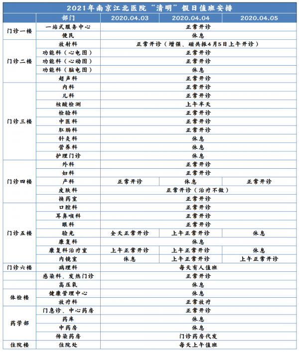 4月3日下午(周六)、4月4日全天(周日):产科、中医科、针灸理疗科停诊;普通门诊开诊