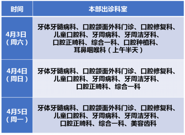3.口腔科4月3日、4月5日全天开诊,口腔正畸门诊4月3日开诊