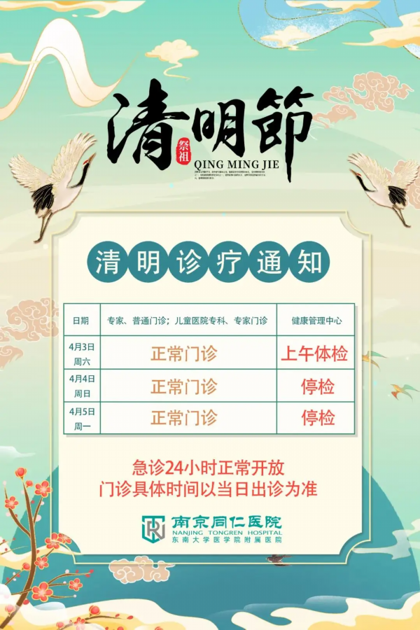 门诊 4月3日(周六)和4月4日(周日)全天休息;4月5日(周一)全天开诊,医技、功能检查科室同步开放
