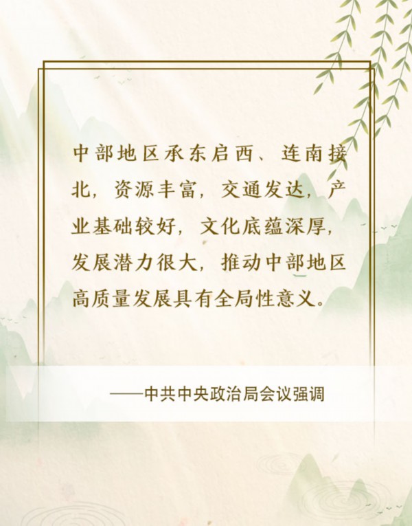 3月30日,习近平总书记主持中共中央政治局会议,审议《关于新时代推动中部地区高质量发展的指导意见》,为新时代中部地区高质量发展指明方向。会议强调,要推动中部地区加快崛起,在全面建设社会主义现代化国家新征程中作出更大贡献。