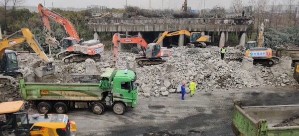 拆除工作正式开启,超20台凿岩机,30台渣土车,其他工程车辆20余辆,同步作业。