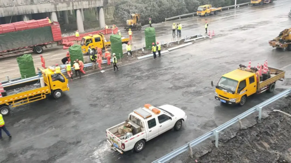 道路清障完毕,开始恢复隔离带和路面。同时,受夜间大雨影响,指挥部决定延长作业时间三小时,预计15点恢复通行。
