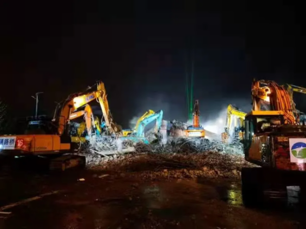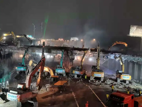 西侧桥面落地。作业过程中,清障与破拆同步进行。
