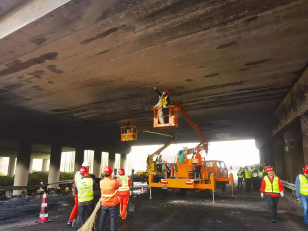 园区紧急召集江苏中基工程技术研究有限公司紧急对海伦路跨线桥进行检测,初步判断桥梁已成危桥,与专家判断一致。