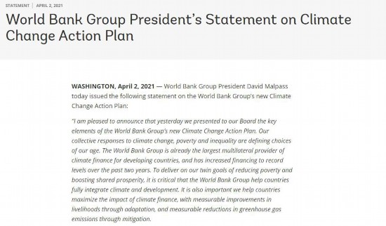 当地时间4月2日,世界银行行长戴维·马尔帕斯宣布将采取一项新的气候变化行动计划,该计划旨在提高减排相关融资额度,以促使相关金融政策与巴黎气候协定保持一致。