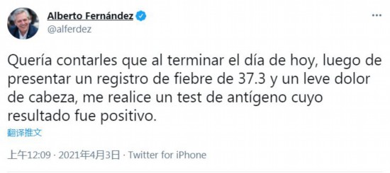 当地时间4月3日凌晨,阿根廷总统费尔南德斯在社交网络发文表示他当天出现了发热、轻微头痛的症状,随后的新冠抗原检测结果呈阳性。费尔南德斯同时透露他已经进行了自我隔离,目前还在等待最后的核酸检测结果。