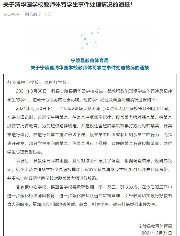 事发后,县教体局高度重视,及时对该事件展开了调查,根据调查结果,经研究决定,给予宁陵县清华学校全县通报批评,取消宁陵县清华园学校2021年评先评优资格,并责成宁陵县清华园学校对段某某老师进行辞退。