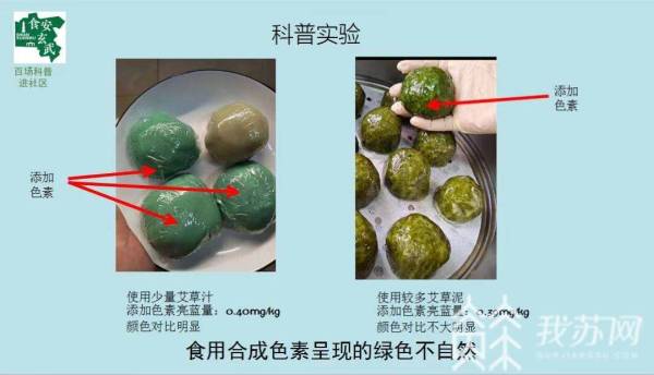 南京海关动植物与食品检测中心部门主管栾军解释:“保持青团的颜色的青,其实在生产工艺、加工工艺上也是有区别的,通过人为、物理的方式,比如在煮艾草的时候加一些碱,用冷水去冰等,就像我们提到的‘杀青’一样,可以保持很绿的颜色,单从颜色上辨别其实是不太能够辨别的。”也就是说,青团特别绿并不一定是添加色素导致,因此,仅凭颜色辨别青团是否违规添加色素也是不科学的。