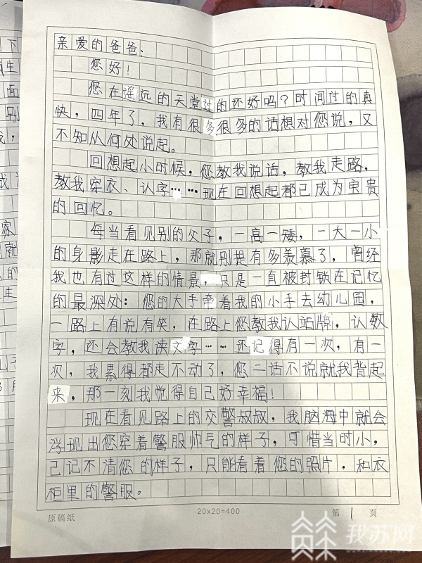 “每当看见别的父子,一高一矮、一大一小的身影走在路上,别提多羡慕了,曾经我也有过这样的情景,只是一直被封锁在记忆的最深处:您的大手牵着我的小手去幼儿园,一路上有说有笑,在路上您教我认站牌,认数字,还会教我读文字……还记得有一次,我累得都走不动了,您二话不说就把我背起来,那一刻我觉得自己好幸福。”小时候,父亲教他说话、走路、穿衣、认字都成为小小少年内心深处最珍贵的回忆,“现在看见路上的交警叔叔,我脑海中就会浮现出您穿警服帅气的样子,可惜当时小,已记不清您的样子,只能看着您的照片和衣柜里的警服。”