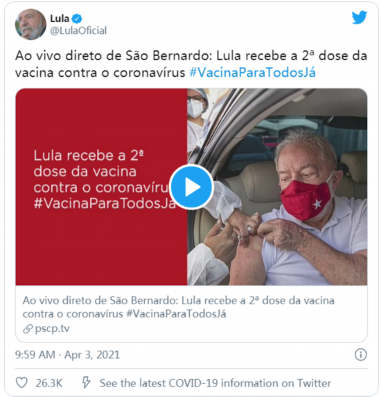 接种完疫苗后,卢拉在社交媒体平台直播时表示:“我想告知亲爱的巴西民众,我已完成第二剂中国科兴新冠疫苗的接种。”他再次强调,即使接种完两剂疫苗,仍不可放松警惕,必须继续佩戴口罩、使用酒精凝胶消毒双手并避免人群聚集。卢拉接种的由中国科兴公司研发的新冠疫苗,其有效性及安全性均得到了巴西政府及医疗专家的认可,从1月17日起这支疫苗在巴西被广泛使用。