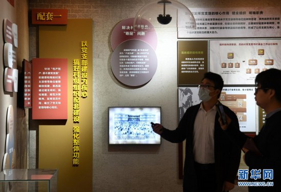 工作人员在“莱西会议专题展”上为观众讲解村级组织建设“三配套”经验(3月25日摄)。新华社记者 李紫恒 摄