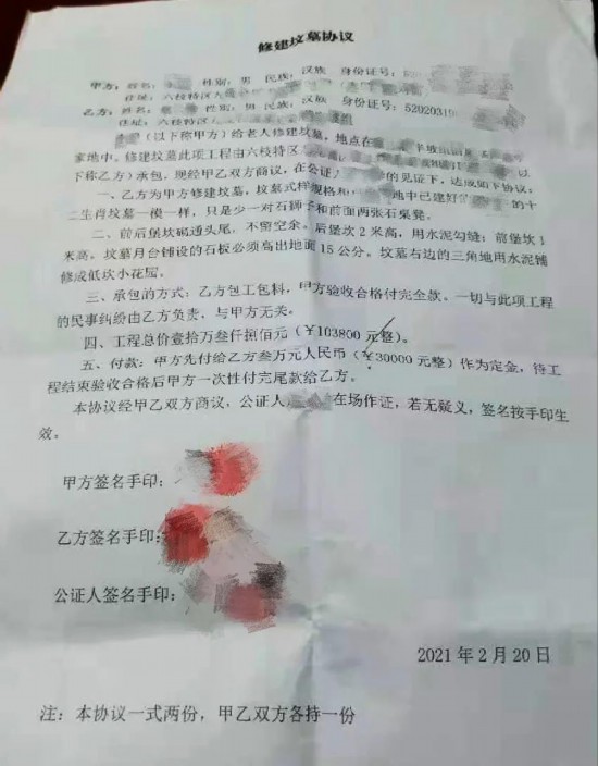 在平寨村购买墓地,同样不需要任何国家明文要求的证明或身份。经营墓地的蔡老板给记者提供了一份今年2月份签的修建坟墓协议,上面写着:所用土地为村民家中土地,工程由他承包。