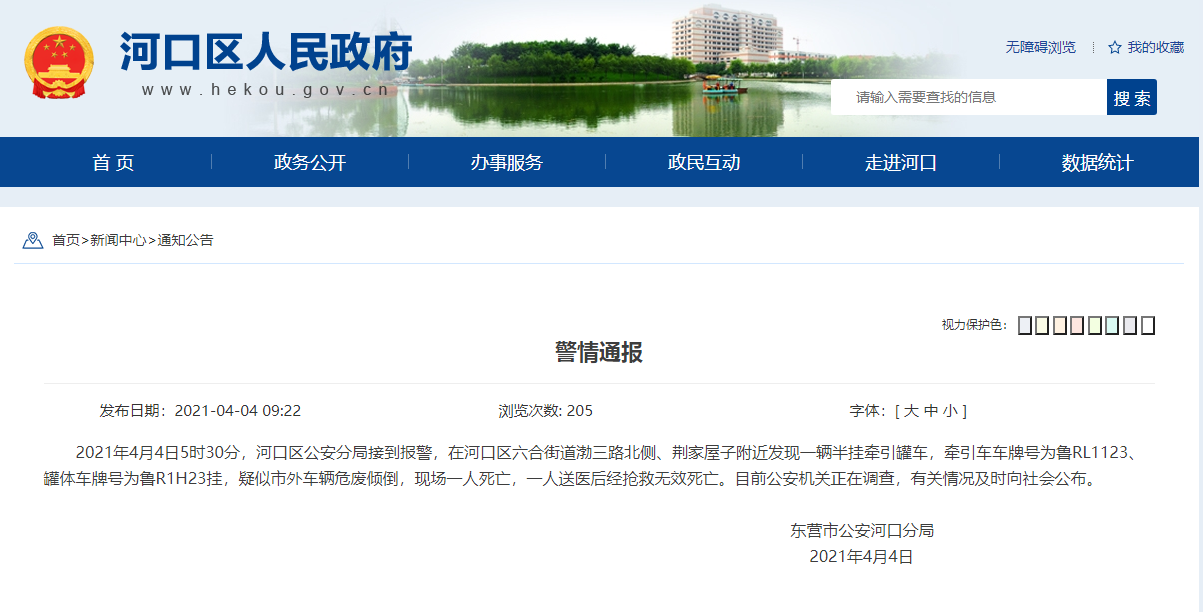 4月4日上午,东营市河口区政府网站发布警情通报。通报称,辖区内发现有疑似市外车辆危废倾倒,现场一人死亡,一人送医后经抢救无效死亡。目前公安机关正在调查。具体通报如下: