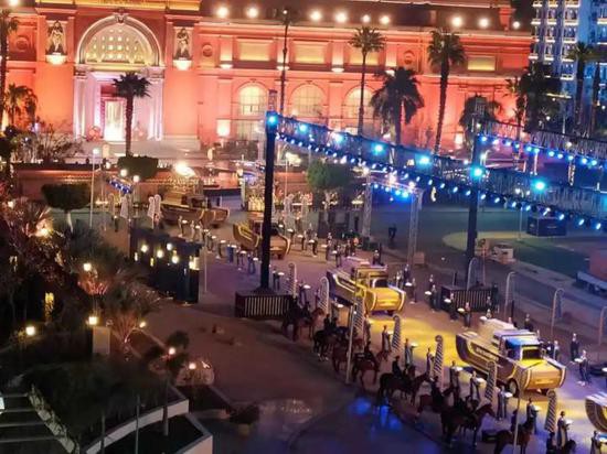 晚8时许,在21响礼炮和庄重的军乐声中,搬迁活动正式开始。修葺一新的解放广场四周灯火璀璨,夜色中的埃及博物馆亮如白昼。靠近尼罗河一侧的博物馆门前,特意辟出一条长长的通道,专供国王、女王和王后们的金色花车行驶。通道两侧,有身着古埃及服装、打扮成法老时期埃及人的民众夹道欢迎,还有骑着骏马的卫兵严阵以待。22具木乃伊分别来自埃及新王国第17至第20王朝,其名包括最有名的拉姆西斯二世国王,以及埃及历史上著名的女王哈谢普苏特。每具木乃伊都单独乘坐一辆装饰成古埃及风格的金黄色花车,每辆金色花车均饰以王朝的名称,并写有主人的名字。车队按照主人的长幼顺序依次缓缓驶过。走出通道后,先是围绕解放广场转一圈,接着驶过开罗多处闹事区,最后到达开罗城南福斯塔特的埃及国家文明博物馆。