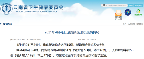 荔枝新闻讯 据云南省卫健委网站消息,4月4日0时至24时,云南省新增确诊病例15例,新增无症状感染者5例。