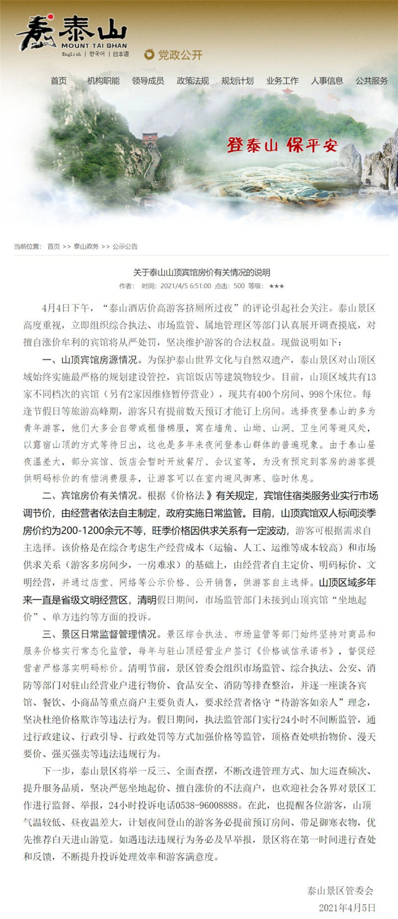 荔枝新闻讯 4月4日下午,“泰山酒店价高游客挤厕所过夜”的评论引起社会关注。泰山景区管委会5日在官网发布《关于泰山山顶宾馆房价有关情况的说明》指出,选择夜登泰山青年游客,大多会自带或租借棉服,窝在墙角、山坳、山洞、卫生间等避风处等待日出。清明假日期间,市场监管部门未接到山顶宾馆“坐地起价”、单方违约等方面的投诉。