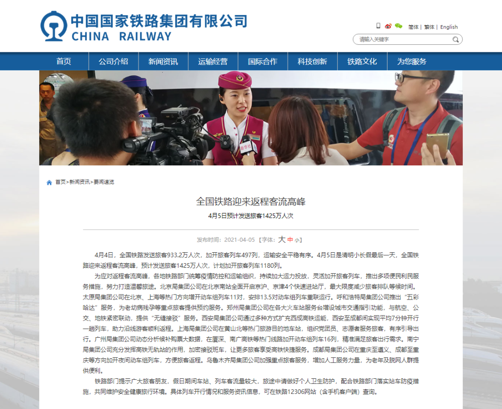 4月4日,全国铁路发送旅客933.2万人次,加开旅客列车497列,运输安全平稳有序。4月5日是清明小长假最后一天,全国铁路迎来返程客流高峰,预计发送旅客1425万人次,计划加开旅客列车1180列。
