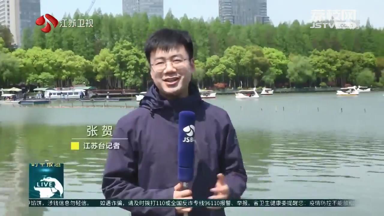 江苏台记者张贺:“在南京玄武湖景区,迎着和煦的春风,大家在湖面上泛舟,在绿道里徒步,在林荫下欢歌舞蹈,共同来感受这明媚的春光。”