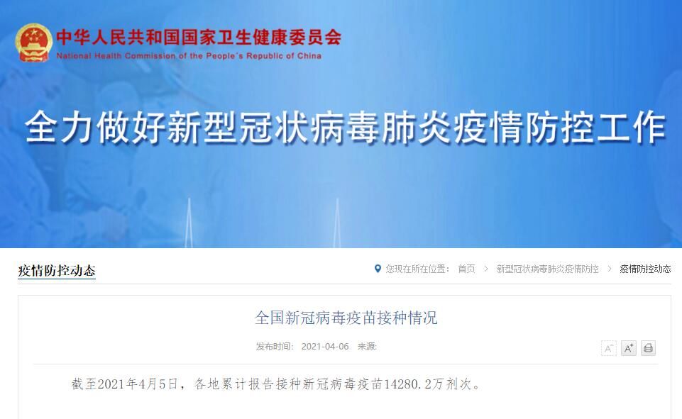 截至2021年4月5日,各地累计报告接种新冠病毒疫苗14280.2万剂次。