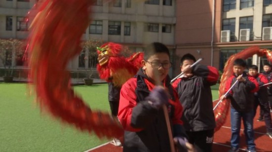 上午9点10分,常州市博爱小学的大课间时间到了。随着下课铃声的响起,老师们迅速就位,布控全场,随即学生们如欢乐的小鸟般,以班级为单位各自占据一角,袋鼠跳、钻山洞、滚铁环、跳房子、老鹰抓小鸡、投壶、扔沙包、竹竿舞等十几种传统游戏有序展开。六年级学生最吸引眼球,一红一绿两条长龙在他们手中上下翻飞。“舞龙特别有意思!”“现在的课间与之前大不相同,感觉传统文化实实在在在我们身边,而且,我对这些还非常感兴趣呢!”“舞了一个月的龙,感觉自己的手臂肌肉有了一点点增加呢!”舞龙的六年级孩子七嘴八舌地说。