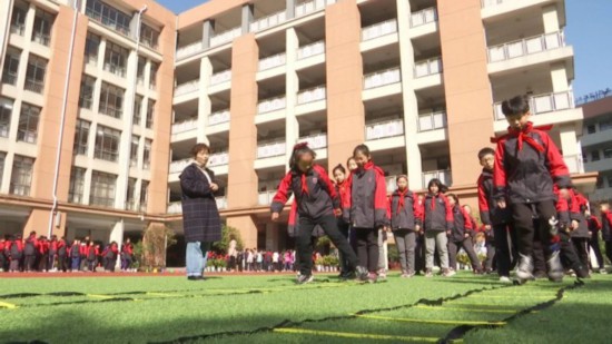 下午1点45分,常州市东坡小学的大课间时间到了。五分钟的课间操之后就是各班的特色活动时间。常州市东坡小学的校舍是新建的,场地宽裕,学校充分利用操场、室内体育馆等校园空间,周密制定大课间活动方案,将球类,跳绳等体育项目,经过校本化改造融入大课间,确保趣味性和运动量。常州市东坡小学校长金贤表示,在保证学生的运动量上,学校首先在时间上保障,开足且上好体育课、体活课,充分保障每天四十分钟的大课间活动。其次,在丰富大课间活动的形式上“翻花样”,目前有44项的趣味运动供每个班选择,很快还将加入结合学校特色编排的书法操和诗歌吟诵操。另外,校方还在研究“课间十分钟”如何让孩子能动起来。“我们不仅重视孩子在学校的运动时间和方式 ,也提倡孩子回家后进行运动打卡,家校联手让运动成为每个孩子的习惯。”金贤告诉记者。