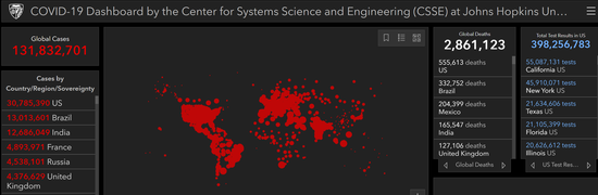 美国约翰·霍普金斯大学发布的新冠疫情最新统计数据截图