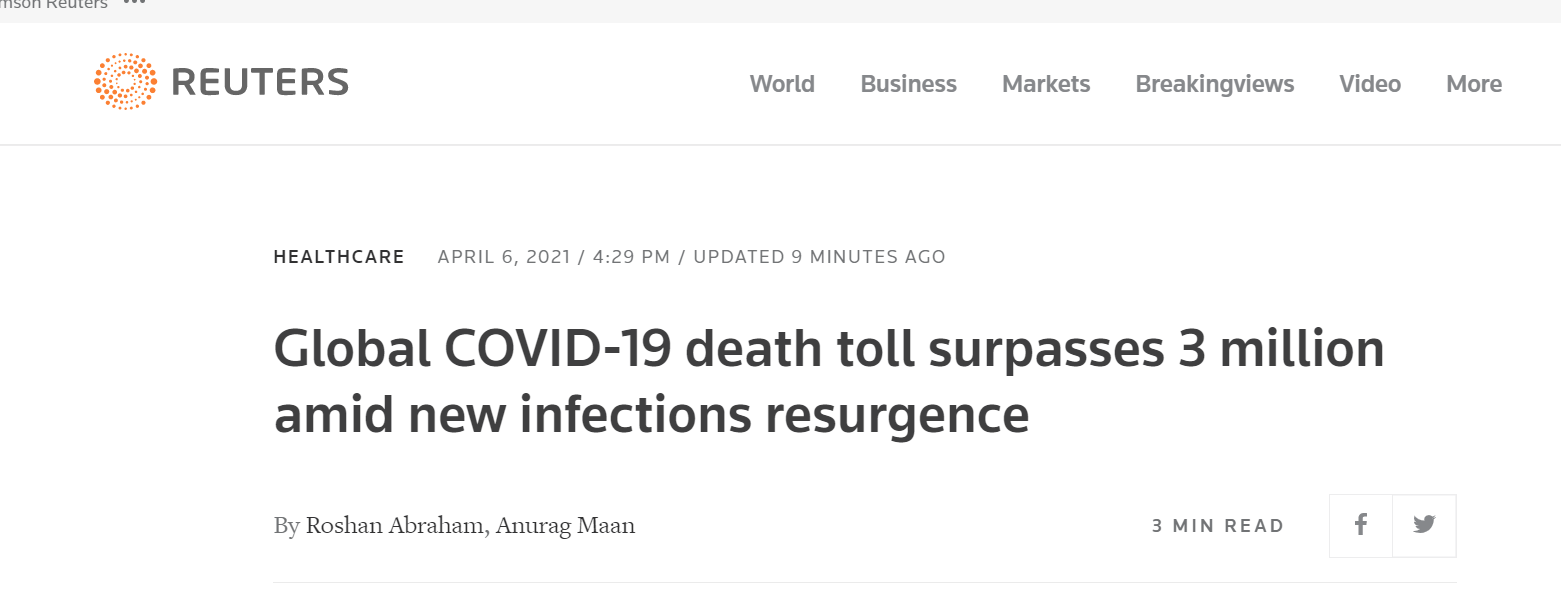 【环球网快讯】路透社刚刚消息称,据该媒体最新统计数据显示,全球新冠死亡病例超300万例。不过,截至北京时间6日16时40分,美国约翰·霍普金斯大学发布的新冠疫情最新统计数据显示,全球累计死亡病例尚未超过300万例,为2861123例。