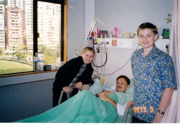 1999年潘维廉在香港一家医院接受癌症手术,和家人在一起。(图源:人民日报客户端)