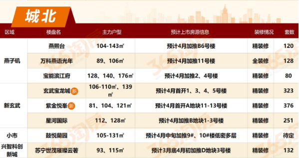 位于江北核心区的纯新盘万科江悦光年预计在4月首开,首批房源约200套,户型在120平方米左右,含装修的房价可能在35000元/㎡左右。另外将加推新房的还有佳源广场玖棠府、启迪水木滨江、花语熙岸府等,南工大和城南中心板块也有新盘亮相。此外,城南的大校场板块将迎来上市潮,金地大成雅境、金基望樾府和天华明阅府将推出新房,首付基本都是8成。城北、江宁、城东等地也将有新房源推出,以刚需和刚改房型为主。