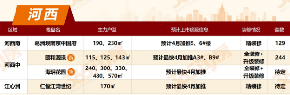 此外,准“地王”盘海玥花园可能会在“银四”期间亮相了,2016年1月以42561元/㎡楼面价成交的该项目,5年过去了仍“待字闺中”。据悉,首批上市房源的面积为240平方米至550平方米,其中300平方米以上的为跃层设计,入市价将参考葛洲坝南京中国府64000元/㎡的价格,也会是“6”字头起步,还将推出“精装包”,提供给有需求的买家。河西中的颐和源璟也传出本月入市的消息,首批将推出200余套新房,“放风价”接近60000元/㎡。