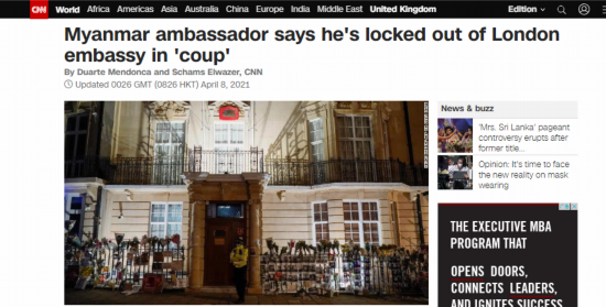 据美国有线电视新闻网(CNN)、英国广播公司(BBC)等多家外媒消息,缅甸驻英国大使吴左绥敏(Kyaw Zwar Minn)当地时间7日表示,自己被关在缅甸驻英国大使馆外,他将此归咎于缅甸军方。