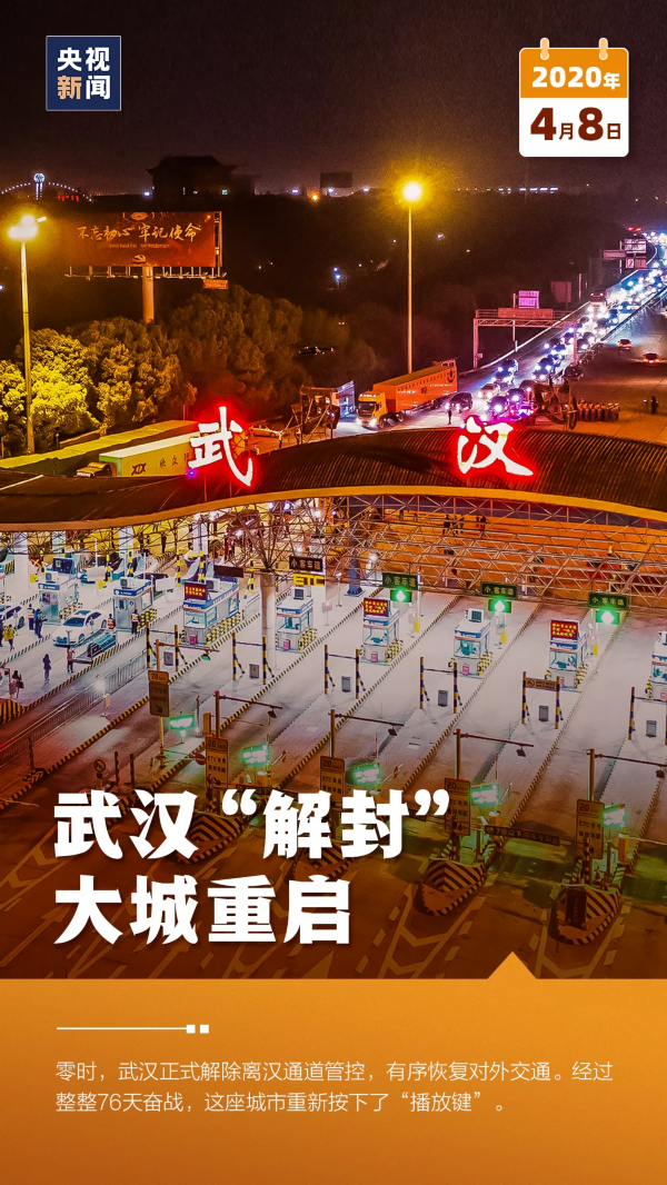 2020年,一场突如其来的新冠肺炎疫情席卷武汉。为了防止疫情进一步扩散,1月23日,这座享有“九省通衢”美誉的城市关闭了所有离汉通道。76天的全力抗疫,武汉挺过来了,2020年4月8日0时,离汉通道管控措施正式解除。