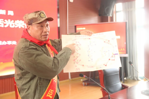 为了让孩子们对战场有更立体的感受,在讲到如何深入敌后摧毁弹药库时,李发安拿出了自己手绘的“作战图”,更生动全面的讲述作战过程。李发安告诉孩子们,每到清明时,他都会一个人背上行囊,去云南烈士陵园,祭奠那些为国捐躯的战友和去他们家中看望其父母。讲到这里,老英雄特别动情地说道:“老战友是我一生难以磨灭的情怀。”