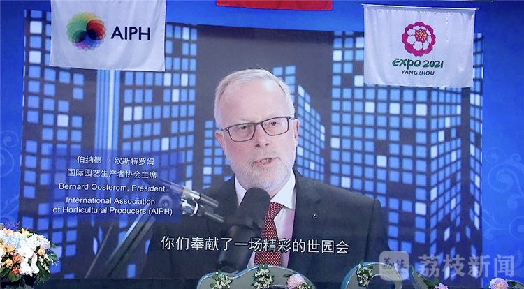国际园艺生产者协会主席伯纳德·欧斯特罗姆通过视频致辞,他们表示,扬州世园会是疫情后全球首个如期举办的国际性园艺盛会,既展现了中国疫情防控取得的重大成果,又奉献了一场精彩的园艺盛会,体现了中国同世界分享生态文明建设新成果的真诚愿望,祝愿本届世园会成为具有“国际水准、时代特征、中国元素、扬州特色”的国际性盛会,希望江苏为共同建设人与自然和谐共生的美丽家园作出新贡献。