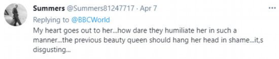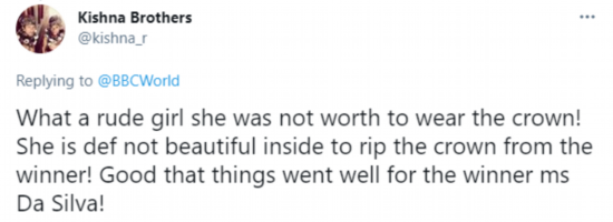 我很同情她(席尔瓦)...她们怎么能这么对待她...上届选美冠军应该感到惭愧吧...不能接受...
