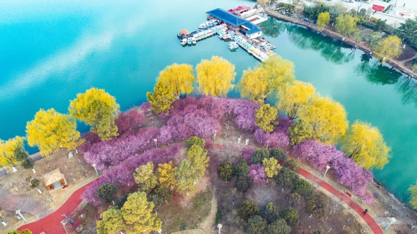 往下走,蔷薇河与东站引河中心河段相遇,形成月牙岛,岛上百花争妍、浪漫怡人、景色秀美,已成为连云港人远足、垂钓、观光的理想胜地。