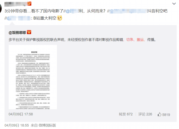 4月9日,中国电视艺术交流协会等发布关于保护影视版权的联合声明。