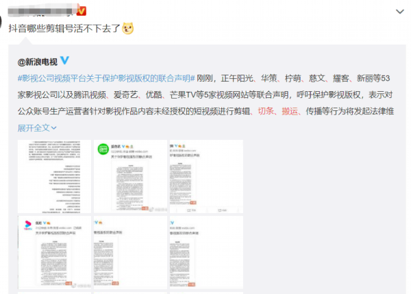 中国电视艺术交流协会、中国电视剧制作产业协会等协会,爱奇艺、腾讯视频、优酷、芒果TV、咪咕视频等视频平台以及正午阳光、华策影视、柠萌影业、慈文传媒、耀客传媒、新丽传媒等影视公司共同呼吁广大短视频平台和公众账号生产运营者尊重原创、保护版权,未经授权不得对相关影视作品实施剪辑、切条、搬运、传播等侵权行为。上述权利人也会采取切实有效的措施,追究侵权人的法律责任,共同遏制公众账号生产运营者未经授权使用影视作品的行业乱象。联合声明如下: