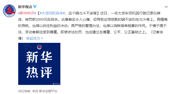 近日,一名大货车司机因行驶记录仪掉线,被罚款2000元后自杀。此事着实令人心痛,但导致这场悲剧的锅不该扣在北斗身上。再精确的导航,也难以刹住利益的冲动;再严格的管理办法,也难以消除简单粗暴的作风。于情于理于法,劳动者都应受到尊重。即使依法处罚,也应建立在尊重、公平、公正基础之上。