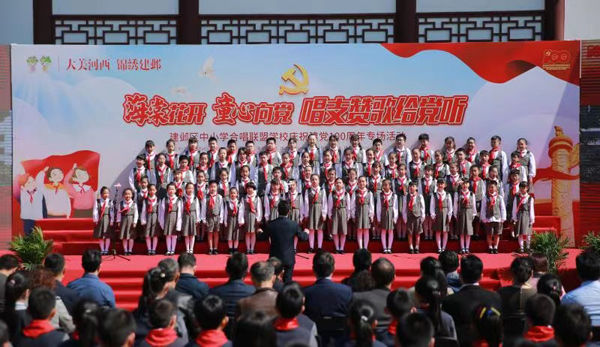 建邺区中小学合唱联盟学校学校的孩子们演唱了《妈妈教我一支歌》、《唱支山歌给党听》、《没有共产党就没有新中国》、《少年中国梦》等歌曲,孩子们用动听的歌声,优美的旋律,传承红色基因,重温党的光辉奋斗历程,在潜移默化中了解党、认识党、热爱党,从小培养爱党、爱国、爱家的朴素情感。