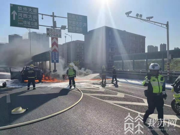无独有偶,4月4日下午3点50分左右,在南京市区凤台南路兴隆大街下桥口处一辆SUV突然起火自燃。消防救援人员发现,该车油箱发生漏液,漏出的汽油瞬间遇火燃烧,火势覆盖了大半路面。交管部门立即进行现场警戒,加大限制通行车辆密度,最终经过20分钟的扑救火势被成功扑灭。