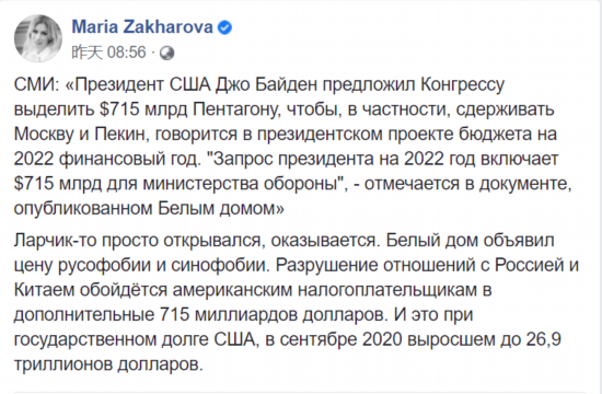 当地时间9日,扎哈罗娃在其脸书上特别提到了此新闻,她还接着评论道:“原来这事简单得很。白宫宣布了俄罗斯恐惧症和中国恐惧症的价格。破坏与俄罗斯和中国的关系将使美国纳税人额外花费7150亿美元。”