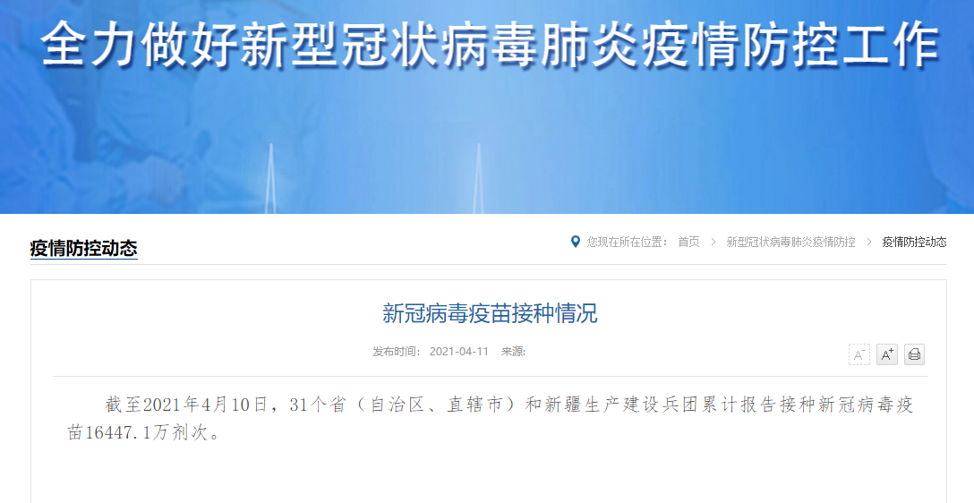 截至2021年4月10日,31个省(自治区、直辖市)和新疆生产建设兵团累计报告接种新冠病毒疫苗16447.1万剂次。