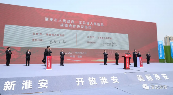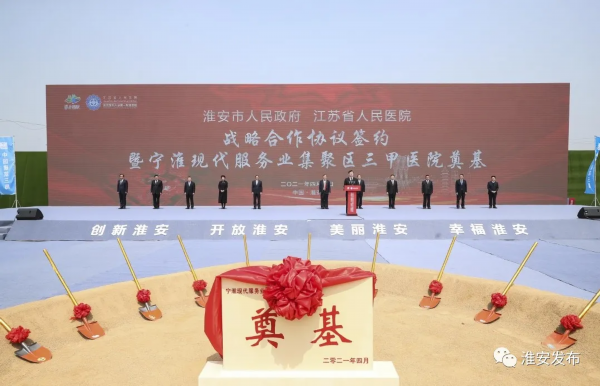4月8日上午,淮安市与省人民医院卫生健康事业发展战略合作协议签约暨宁淮现代服务业集聚区三甲医院奠基仪式举行。这既是宁淮挂钩深度合作的最新成果,也标志着双方院府合作迈上新台阶。江苏省人民医院党委书记唐金海、院长赵俊,市领导陈之常、顾坤、王红红等参加活动。