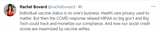 “疫苗接种自拍”可以“拯救生命”的话题,很快在社交媒体上引发关注并掀起讨论。有网友则认为,“个人疫苗状态不关任何人的事。医疗保健隐私过去一直很重要。但后来,新冠应对放松了《健康保险隐私及责任法案》(的相关要求),这样政府和大型科技公司就可以跟踪我们情况并以此赚钱。而现在,我们的社会信用评分(却)需要通过疫苗自拍来(实现)最大化。”↓