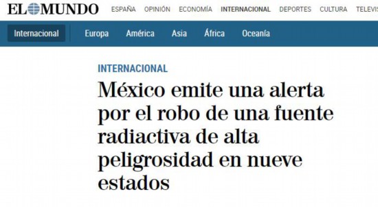 据西班牙《世界报》、埃菲社等媒体报道,当地时间4月11日,墨西哥政府向包括墨西哥州、伊达尔戈州在内的9个州发出警报,称高度危险的放射源被盗,呼吁公民采取预防措施。